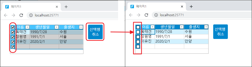 페이지를 실행하고 페이지에서 여러 행의 데이터를 선택한 다음 선택 취소 버튼 클릭하면 선택한 모든 행의 선택이 취소됩니다.
