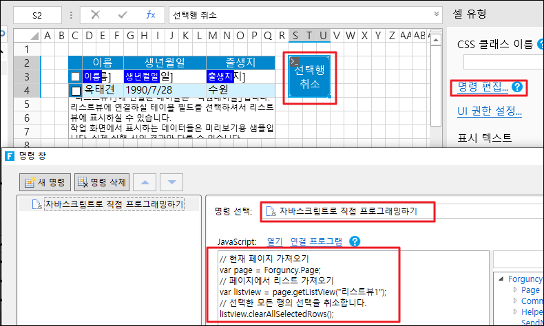 2. 셀 범위를 선택하고 셀 유형을 버튼을 설정하고 명령을 \[자바스크립트로 직접 프로그래밍하기]으로 편집하고 JavaScript 코드를 입력합니다.