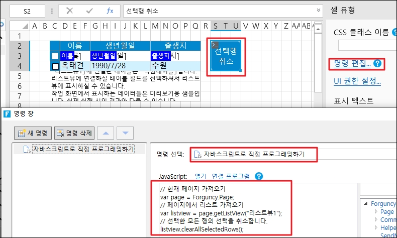 셀 범위를 선택하고 셀 유형을 버튼을 설정하고 명령을 [자바스크립트로 직접 프로그래밍하기]으로 편집하고 JavaScript 코드를 입력합니다.