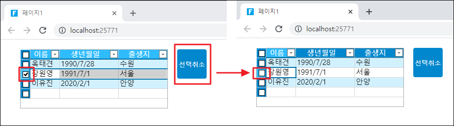페이지를 실행하고 페이지에서 두 번째 데이터 행을 선택한 다음 선택 취소 버튼을 클릭하면 두 번째 행이 선택 취소됩니다.