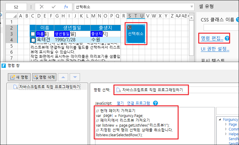 2. 셀 범위를 선택하고 셀 유형을 버튼으 설정하고 명령을 \[자바스크립트로 직접 프로그래밍하기]으로 편집하고 JavaScript 코드를 입력합니다.