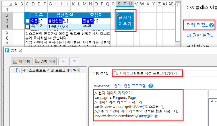 다음 예제 코드에서는 clearSelectedRowByQuery 메서드를 사용하여 쿼리 조건에 따라 리스트의 선택 행을 지웁니다.
