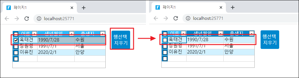 페이지를 실행하고 테이블에서 데이터 행을 선택한 다음 행 선택 지우기 버튼 누르면 쿼리 조건에 따라 테이블의 선택 행이 지워집니다.