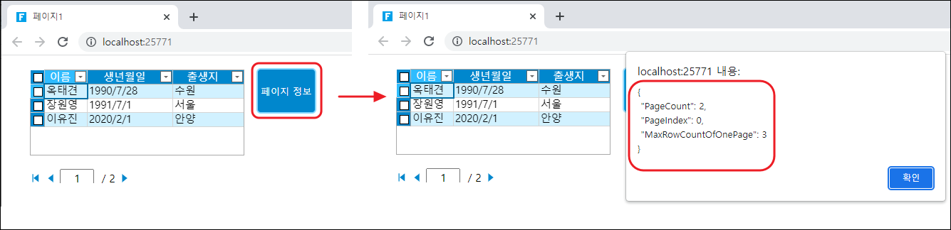 페이지를 실행하고 페이지에서 페이지 번호 정보 버튼을 클릭하면 총 페이지 번호, 현재 페이지 번호 인덱스 및 페이지당 행 수를 포함하여 테이블의 페이지 번호 정보를 표시하는 경고 상자가 나타납니다.