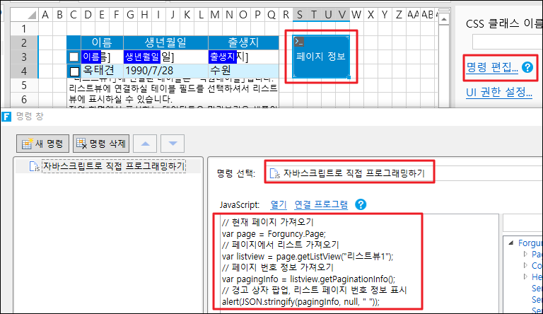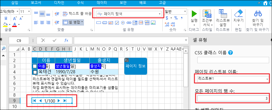 2. 셀 범위를 선택하고 셀 유형을 페이지 탐색 버튼을 설정하고 페이징 리스트뷰 이름을 "리스트뷰1"로  모든 페이지당 행 수를 3개로 설정합니다.