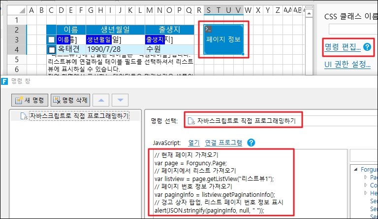 셀 범위를 선택하고 셀 유형을 페이지 탐색 버튼을 설정하고 페이징 리스트뷰 이름을 "리스트뷰1"로 모든 페이지당 행 수를 3개로 설정합니다.