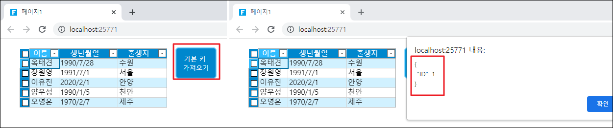 페이지를 실행하고 페이지에서 기본 키 가져오기 버튼을 클릭하면 지정된 행의 기본 키 정보를 표시하는 경고 상자가 나타납니다.