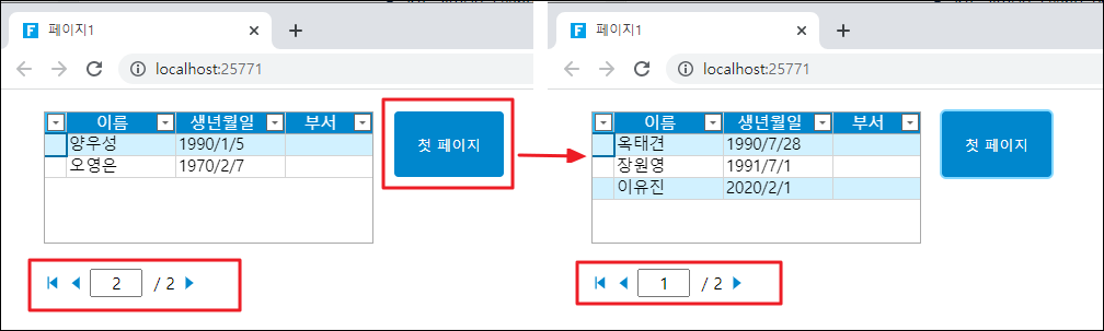 다음 예제 코드에서는 goToFirstPage 메서드를 통해 표시되는 리스트 데이터가 첫 페이지로 이동합니다.