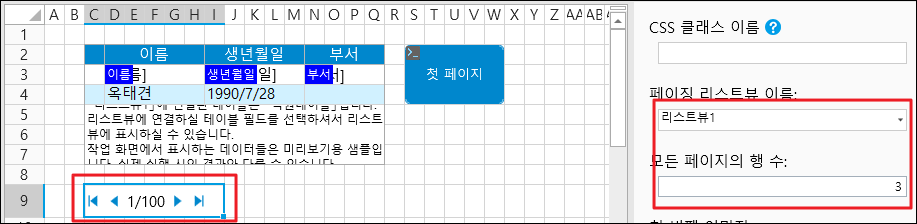 2. 셀 범위를 선택하고 셀 유형을 페이지 탐색 버튼로 설정하고  페이징 리스트뷰 이름을 리스트뷰로설정하고 페이지당 행 수를 3개로 설정합니다.