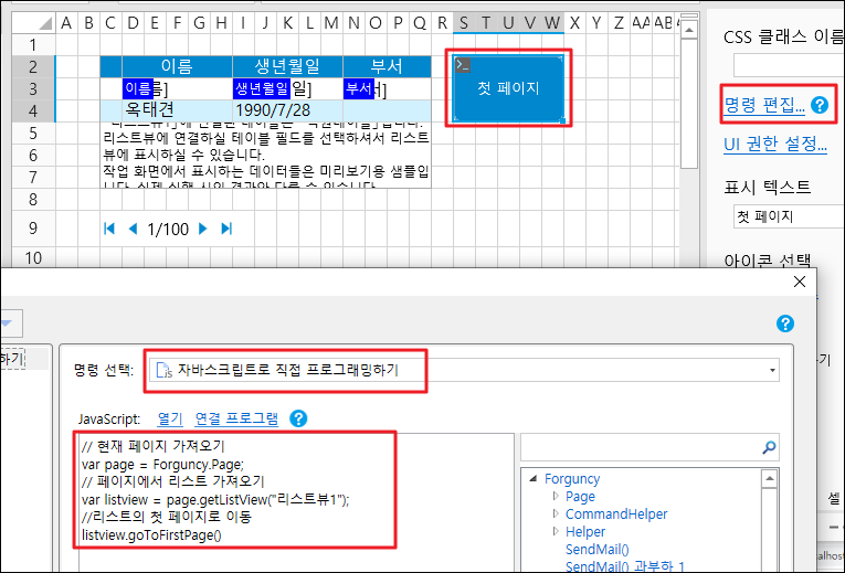 ![](https://help.grapecity.com.cn/download/thumbnails/72365725/%E6%AD%A5%E9%AA%A42.png?version=1\&modificationDate=1648092734000\&api=v2)셀 범위를 선택하고 셀 유형을 버튼으로 설정하고 명령을 \[자바스크립트로 직접 프로그래밍하기]으로 편집하고 JavaScript 코드를 입력합니다.