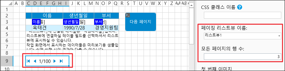 ![](https://help.grapecity.com.cn/download/thumbnails/72365640/%E6%AD%A5%E9%AA%A42.png?version=1\&modificationDate=1648092732000\&api=v2)셀 범위를 선택하고 셀 유형을 페이지 탐색 버튼로 설정하고  페이징 리스트뷰 이름을 리스트뷰로설정하고 페이지당 행 수를 3개로 설정합니다.