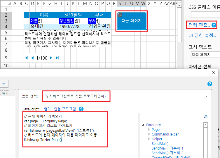 ![](https://help.grapecity.com.cn/download/thumbnails/72365670/%E6%AD%A5%E9%AA%A43.png?version=1\&modificationDate=1648092733000\&api=v2) 셀 범위를 선택하고 셀 유형을 버튼으로 설정하고 명령을 \[자바스크립트로 직접 프로그래밍하기]으로 편집하고 JavaScript 코드를 입력합니다.