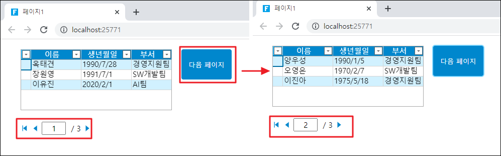 페이지를 실행하면 테이블이 기본적으로 첫 번째 페이지의 데이터를 표시하고 다음 페이지 버튼을 클릭하면 두 번째 페이지로 이동합니다.