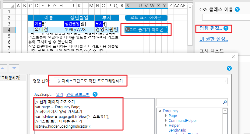 2. 셀 범위를 선택하고 셀 유형을 버튼으로 설정하고 명령을 \[자바스크립트로 직접 프로그래밍 하]으로 편집하고 JavaScript 코드를 입력합니다.