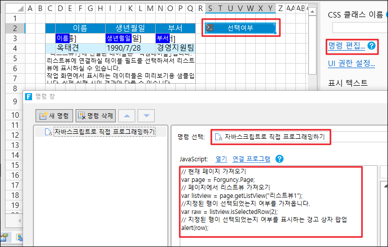 2. 셀 범위를 선택하고 셀 유형을 버튼으로 설정하고 명령을 \[자바스크립트로 직접 프로그래밍하기]으로 편집하고 JavaScript 코드를 입력합니다.
