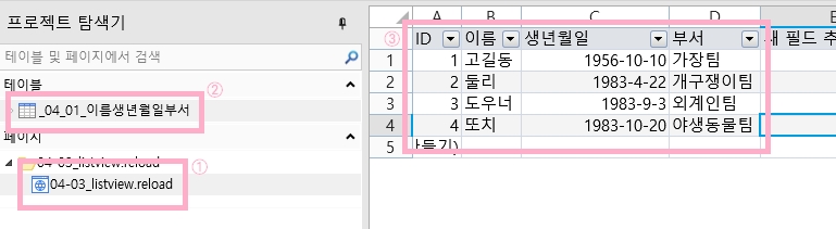 6. 프로젝트를 생성합니다. 페이지가 로딩된 후 데이터베이스를 변경합니다. 프로젝트를 저장하고 다시 웹페이지로 돌아가서 Reload 버튼을 클릭하면 ListView에 새로 입력한 데이터가 나타납니다.