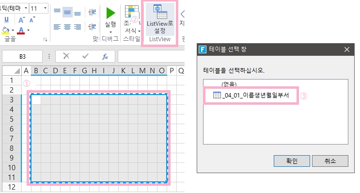2. 화면의 영역을 선택하고 “ListView로 설정” 기능을 이용하여, ListView를 생성합니다. 이 때, 데이터베이스를 선택하라고 나타나는데, 위에서 생성한 테이블을 선택하시면 됩니다.