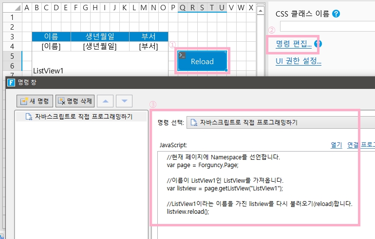 리스트뷰 설정에서 "데이터 새로 고침"을 설정할 수 있으며, 이 옵션을 선택하지 않으면 reload 메서드를 사용하여 데이터베이스에서 데이터를 다시 로드할 수 있습니다.