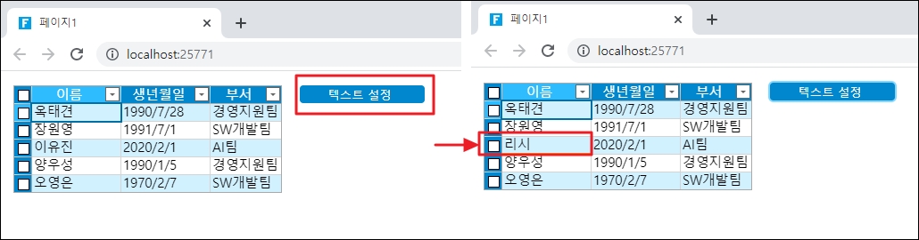 페이지를 실행하고 페이지에서 텍스트 설정 버튼 클릭하면 표의 위치를 지정하는 셀에 텍스트가 설정됩니다.