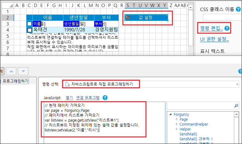 2. 셀 범위를 선택하고 셀 유형을 버튼으로 설정하고 명령을 \[자바스크립트로 직접 프로그래밍하기]으로 편집하고 JavaScript 코드를 입력합니다.