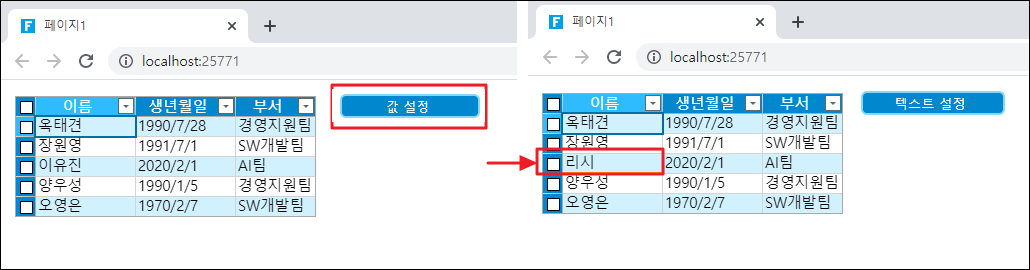 페이지를 실행하고 페이지에서 값 설정 버튼을 클릭하면 지정한 셀에 대한 값이 설정됩니다.