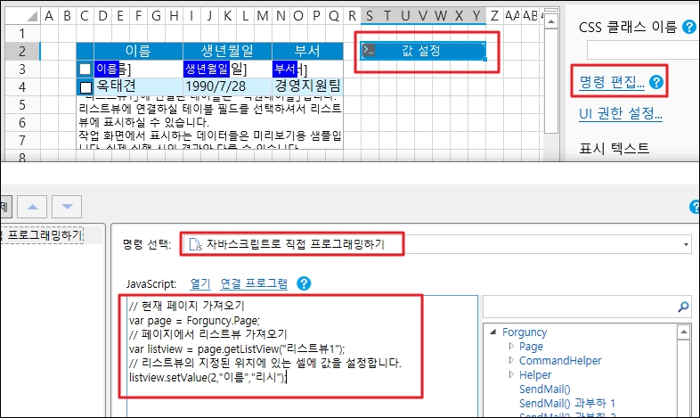 셀 범위를 선택하고 셀 유형을 버튼으로 설정하고 명령을 [자바스크립트로 직접 프로그래밍하기]으로 편집하고 JavaScript 코드를 입력합니다.