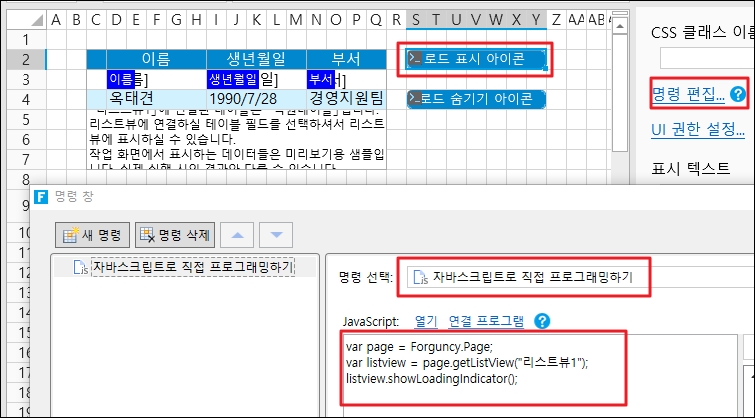 셀 범위를 선택하고 셀 유형을 버튼으로 설정하고 명령을 [자바스크립트로 직접 프로그래밍 하]으로 편집하고 JavaScript 코드를 입력합니다.
