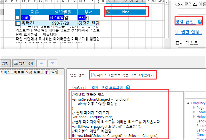 3. 디자이너에서 버튼을 선택하고 명령을 편집하고 JavaScript 코드에 한 줄의 코드를 추가합니다.
