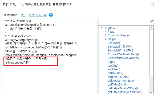 다음 예제 코드에서는 unbindAll 메서드를 사용하여 테이블의 모든 이벤트 바인딩을 제거합니다.