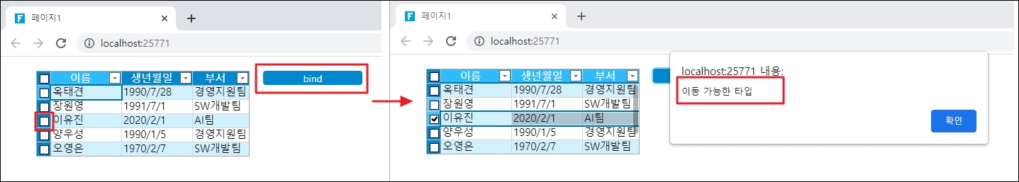 페이지를 실행하고 페이지에서 버튼을 클릭한 다음 테이블의 현재 행을 변경하면 경고 상자가 나타납니다.