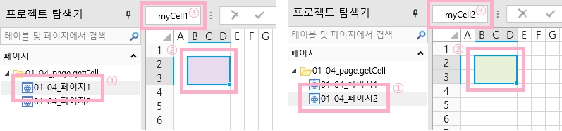 “페이지1”의 셀에는 myCell1, “페이지2”의 셀에는 myCell2라고 입력합니다. 화면 좌측 위에 입력하시면 됩니다.