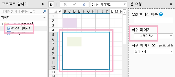 “페이지1”에서 아래와 같이 셀 범위를 선택 > 셀 유형을 “내용이 포함된 셀 타입” 선택 > 하위 페이지로 “페이지2”를 지정합니다.