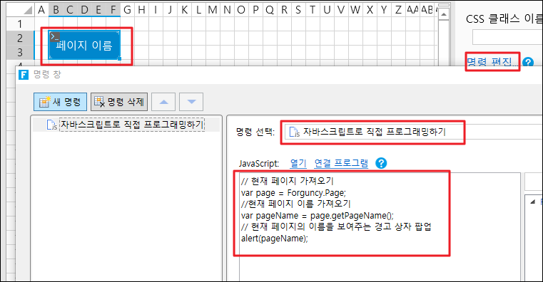 ![](https://help.grapecity.com.cn/download/thumbnails/72366106/%E6%AD%A5%E9%AA%A41.png?version=1\&modificationDate=1648092740000\&api=v2)해당 페이지에 버튼을 생성하고, “자바스크립트로 직접 프로그래밍하기” 명령으로 코드를 추가합니다.