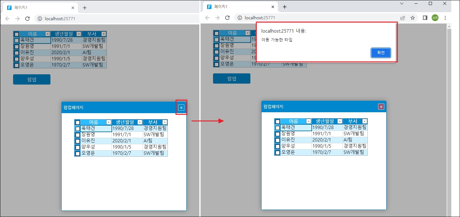 페이지를 실행하고 테이블에서 팝업버튼을 클릭하여 팝업페이지를 띄우고, 닫기 버튼을 클릭하여 팝업 페이지가 닫히면 경고 상자가 나타납니다.