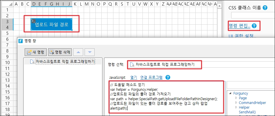 다음 예제 코드에서는 getUploadFileFolderPathInDesigner 메서드를 사용하여 디자이너에 업로드된 파일의 폴더 경로를 가져옵니다.