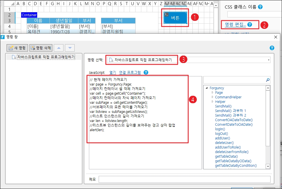 페이지 2에서 셀 범위를 선택하고, 셀 유형을 버튼으로 설정하고, 명령을 [자바스크립트로 직접 프로그래밍하기]으로 편집하고, JavaScript 코드를 입력합니다.
