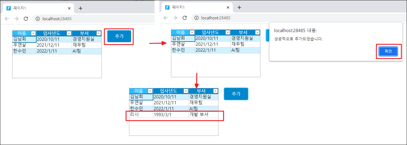 페이지를 실행하고 추가**버튼을** 클릭하면 추가 성공이 표시된 경고 상자가 나타납니다.<br>