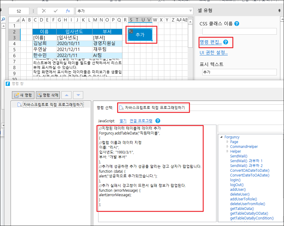 ![](https://help.grapecity.com.cn/download/thumbnails/72364571/%E6%AD%A5%E9%AA%A42.png?version=1\&modificationDate=1648092717000\&api=v2) 셀 범위를 선택하고 셀 유형을 단추로 설정하고 명령을 \[JavaScript 명령]으로 편집하고 JavaScript 코드를 입력합니다.