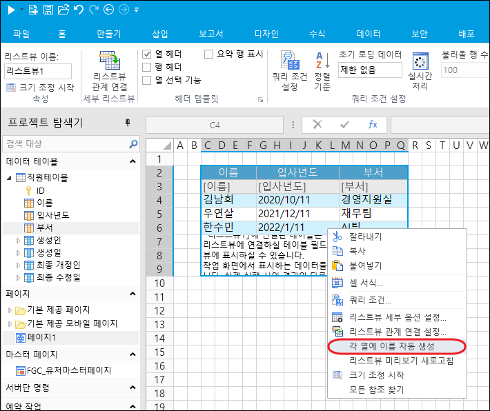 ![](https://help.grapecity.com.cn/download/thumbnails/72364571/%E6%AD%A5%E9%AA%A41.png?version=1\&modificationDate=1648092717000\&api=v2) 페이지에서 범위를 선택하고, 데이터 테이블을 셀 범위로 드래그하고, 데이터 테이블의 필드를 바인딩하고, 각 열의 열 이름을 설정합니다.