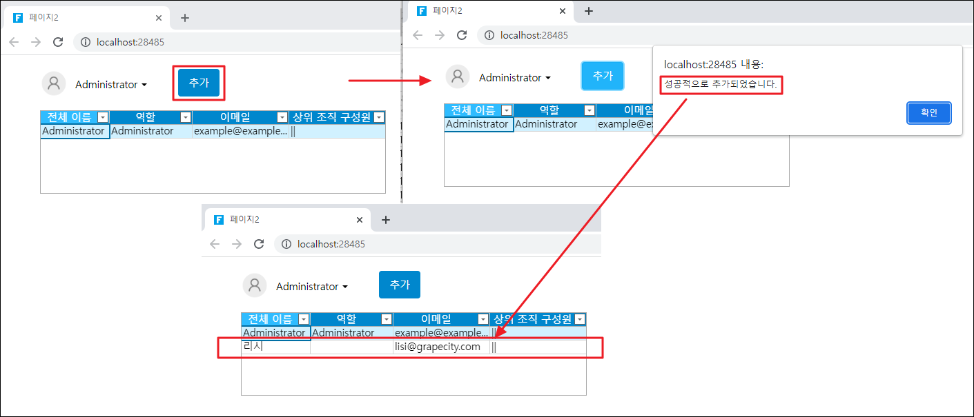 페이지를 실행하고 관리자를 사용하여 로그인한 후 페이지에서 사용자 추가 버튼 클릭하면 추가가 성공한다는 경고 상자가 나타납니다.