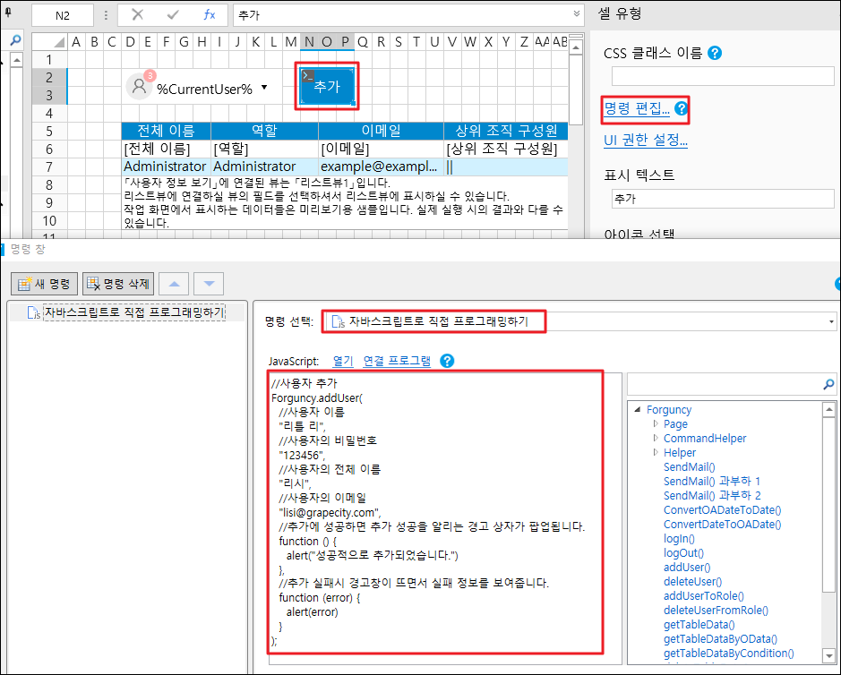 셀 범위를 선택하고 셀 유형을 버튼으 설정하고 명령을 [JavaScript 명령]으로 편집하고 JavaScript 코드를 입력합니다.