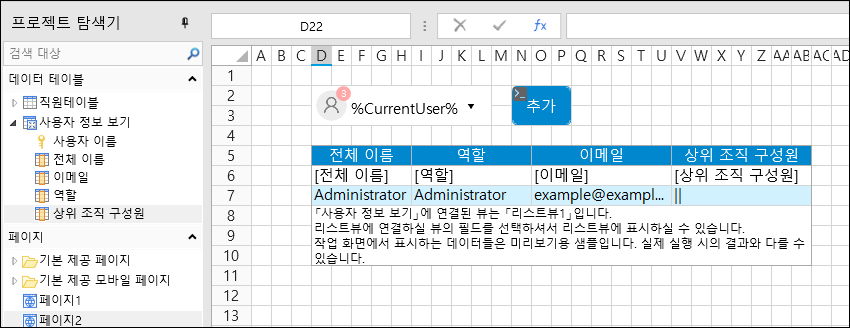 페이지에서 범위를 선택하고 셀 유형을 로그인한 사용자로 설정하고 사용자 정보 보기를 테이블에 바인딩합니다.