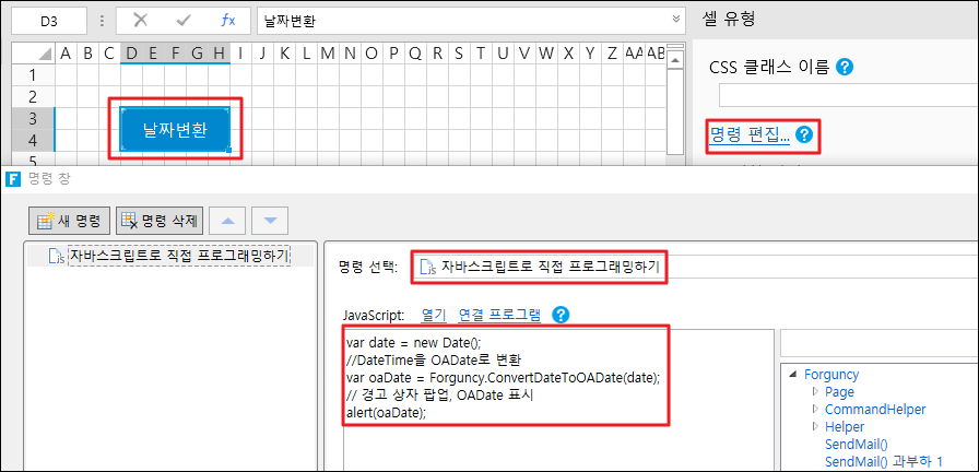 1. 페이지에서 셀 범위를 선택하고 셀 유형을 단추로 설정하고 명령을 \[JavaScript 명령]으로 편집하고 JavaScript 코드를 입력합니다.