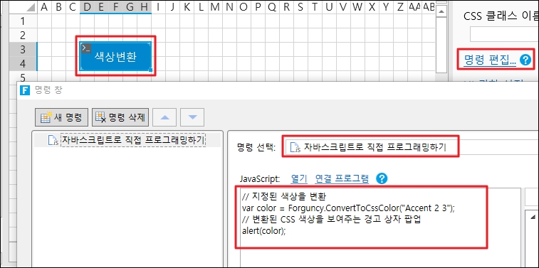 페이지에서 셀 범위를 선택하고 셀 유형을 버튼으로 설정하고 명령을 [JavaScript 명령]으로 편집하고 JavaScript 코드를 입력합니다.