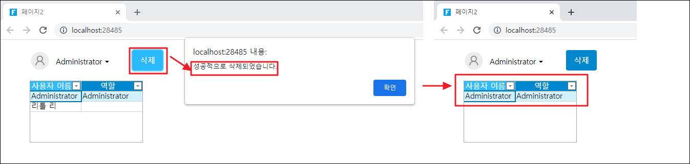 페이지를 실행하고 관리자를 사용하여 로그인한 후 페이지에서 삭제 버튼을 클릭하면 삭제가 성공한다는 경고 상자가 나타납니다.