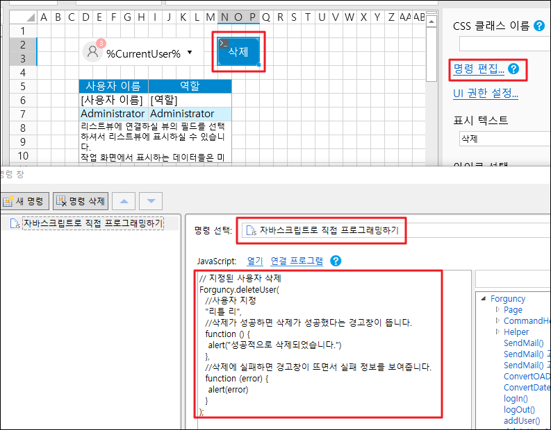 ![](https://help.grapecity.com.cn/download/thumbnails/72364658/%E6%AD%A5%E9%AA%A42.png?version=1\&modificationDate=1648092718000\&api=v2) 셀 범위를 선택하고 셀 유형을 버튼으로 설정하고 명령을 \[JavaScript 명령]으로 편집하고 JavaScript 코드를 입력합니다.