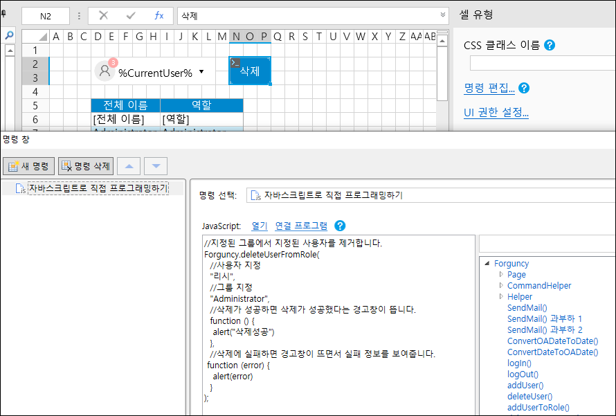![](https://help.grapecity.com.cn/download/thumbnails/72364643/%E6%AD%A5%E9%AA%A42.png?version=1\&modificationDate=1648092718000\&api=v2) 셀 범위를 선택하고 셀 유형을 버튼을 설정하고 명령을 \[JavaScript 명령]으로 편집하고 JavaScript 코드를 입력합니다.