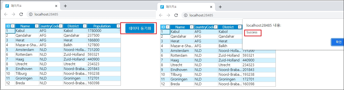 페이지를 실행하고 데이터 동기화 버튼을 클릭하면 동기화가 성공한다는 경고 상자가 나타납니다.