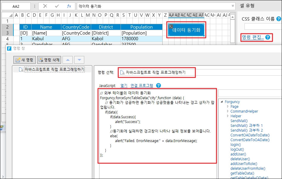 셀 범위를 선택하고 셀 유형을 단추로 설정하고 명령을 [JavaScript 명령]으로 편집하고 JavaScript 코드를 입력합니다.