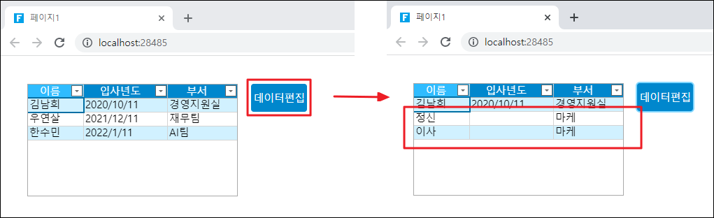 페이지를 실행하고 페이지에서 데이터 편집 버튼을 클릭하면 데이터 테이블의 데이터가 추가/삭제됩니다.&#x20;